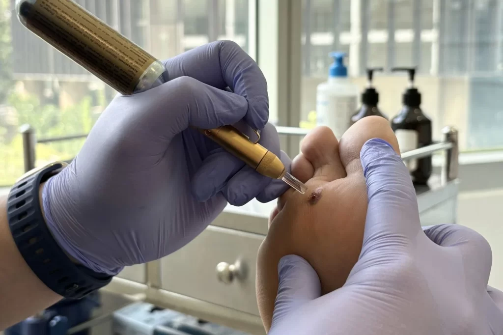 Podiatrist in Singapore performing wart cryotherapy on patient's foot