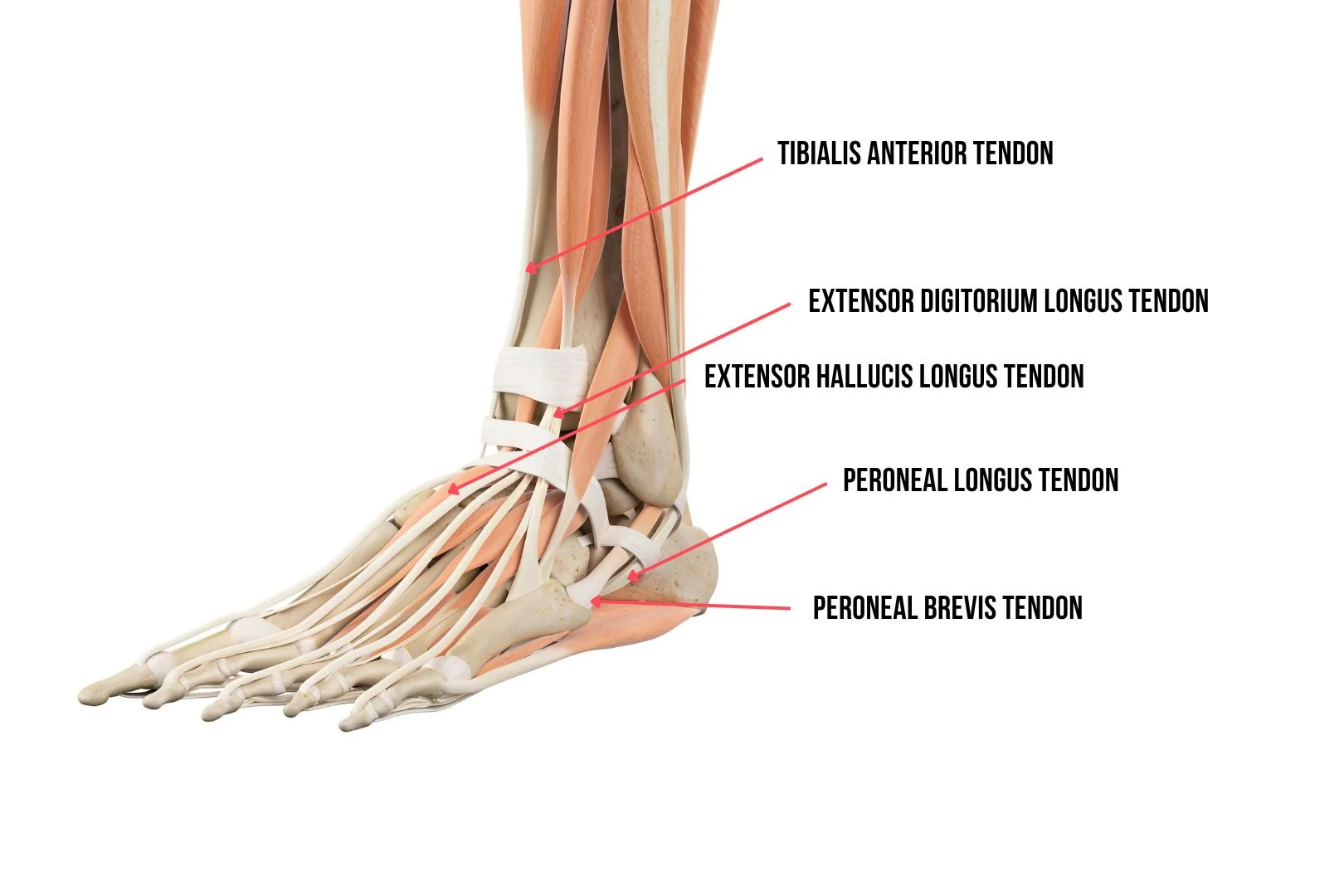 Your ankle is powered by a network of muscles that work together to move your foot up and down. The calf muscles, including the gastrocnemius and soleus, help you point your toes downward (plantarflexion), while muscles on the front of your leg, like the tibialis anterior, help you lift your toes up (dorsiflexion). Each of the above tendons is connected to their respective muscles, and together, they work hand in hand to control the movements of your foot and ankle.